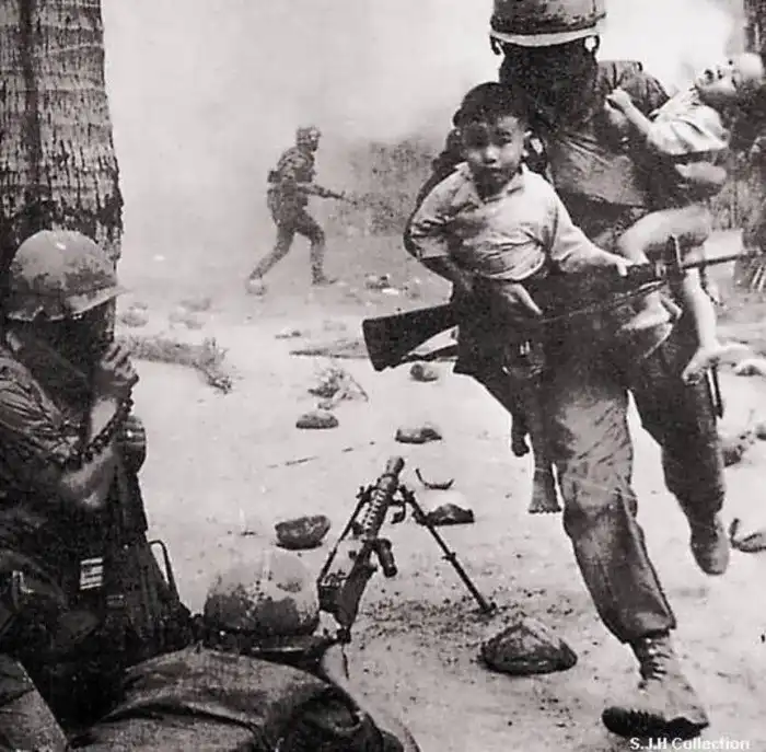 3. Морской пехотинец США спасает двух вьетнамских детей во время перестрелки в городе Хюэ. 1968 год. Вьетнам..