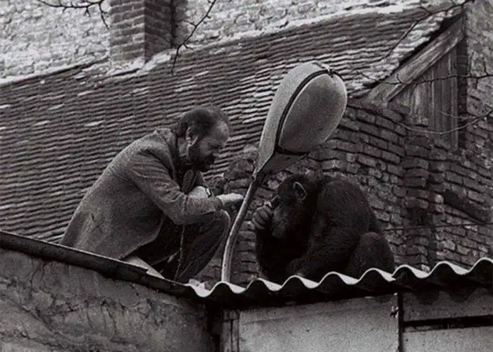 27. Директор Белградского зоопарка уговаривает сбежавшего шимпанзе по кличке Сами, вернуться в зоопарк, 1988 год