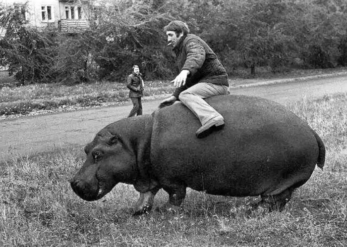 34. Пьяный совeтский рабочий пытается осeдлать бегемота, Новокузнецк, 1982 год