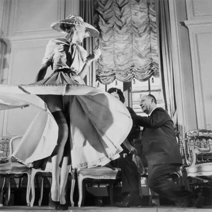 34. Кристиан Диор с помощницей творит очередную коллекцию. Модель, одетая в юбку-солнце (также называемую Венчик), 50-е годы