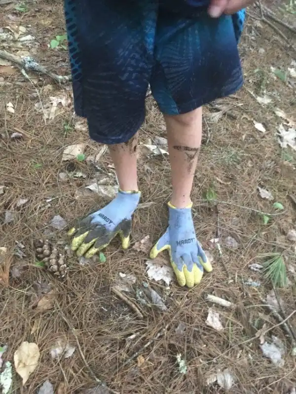 Мы отправились на прогулку в лес, и брат решил пойти босиком. Когда он понял, что идея была не очень, он придумал выход