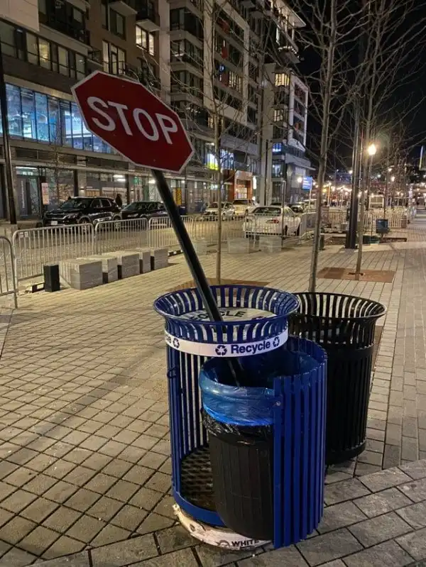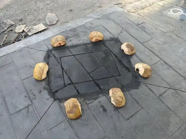 Вокруг свежего цемента вместо конусов поставили кокосы