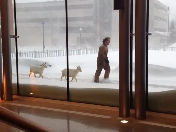 Ничего особенного, просто мужчина прогуливается по городу вместе с двумя снежными козочками
