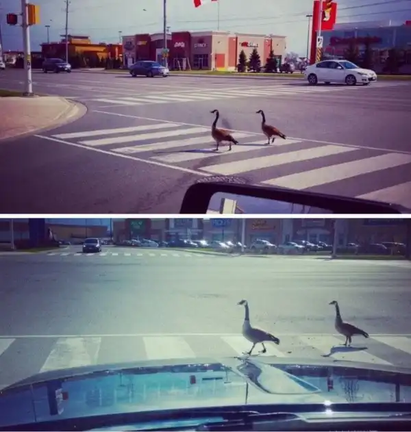 Гуси в Канаде привыкли жить рядом с людьми. Они постоянно передвигаются по улицам городов и давно никого не смущают