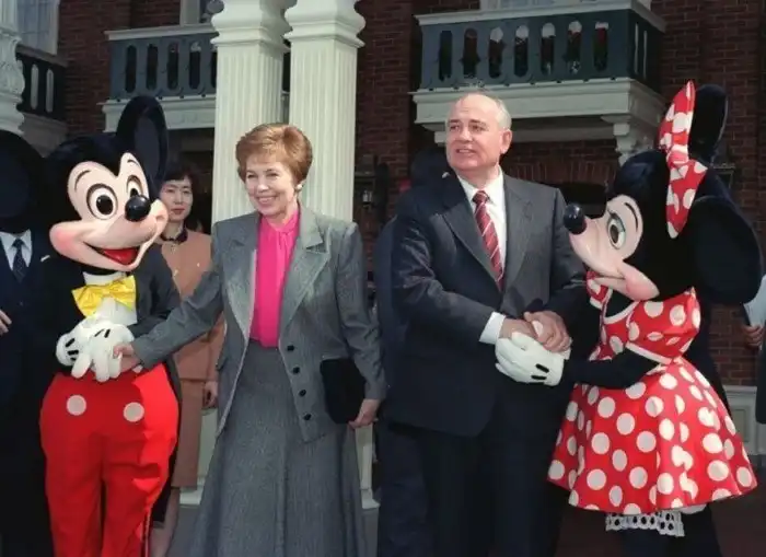11. Бывший президент СССР Михаил Горбачев и его жена Раиса пожимают руки Микки и Минни Маус у входа в Токийский Диснейленд, 12 апреля 1992 год