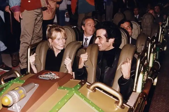 12. Клаудия Шиффер и Дэвид Копперфильд на открытии Space Mountain в парижском Диснейленде. 1995 год