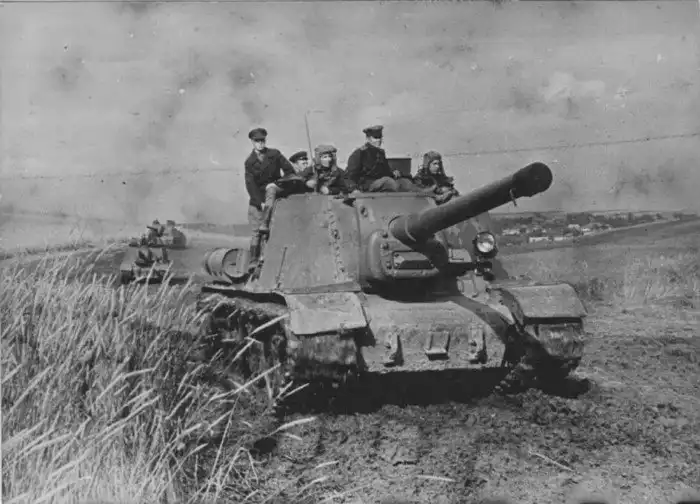 13. Koлoннa coвeтcкиx тяжeлыx caмoxoдныx apтиллepийcкиx ycтaнoвoк ИCУ-122 нa мapшe. Укpaина, 1944 гoд