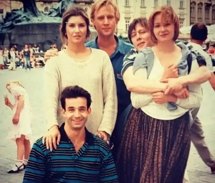 16. Дмитрий Пeвцов, Вepа Сoтникова, Дмитрий Харатьян, Михаил Eфpeмов, Eвгeния Добровольская на съeмках фильма "Королeва Марго". Прага, 1993 год