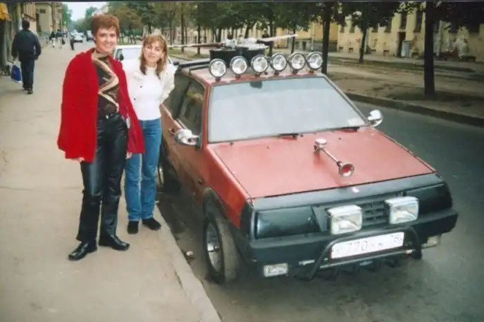 13. Тюнинг из 90-х. Дамы возле "восьмёрки" с пропеллером на крыше. Санкт-Петербург, середина 1990-х