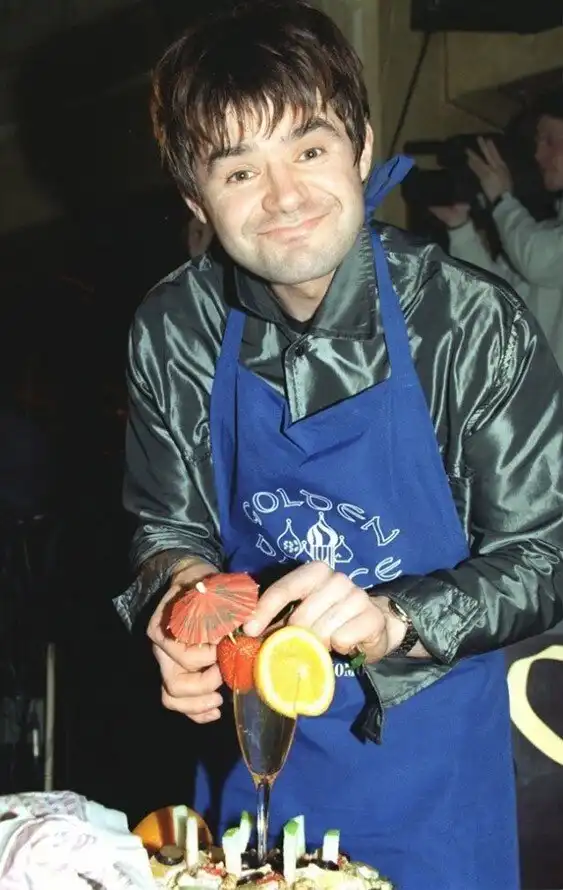 28. Евгений Осин делает себе коктейль на одной из вечеринок в GoldenPalace. Москва, 1990-е годы