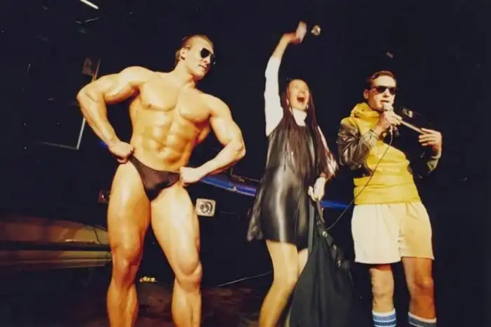 15. Артист Ефим Шифрин вместе с бодибилдером Александром Вишневским. Россия, 1990-годы