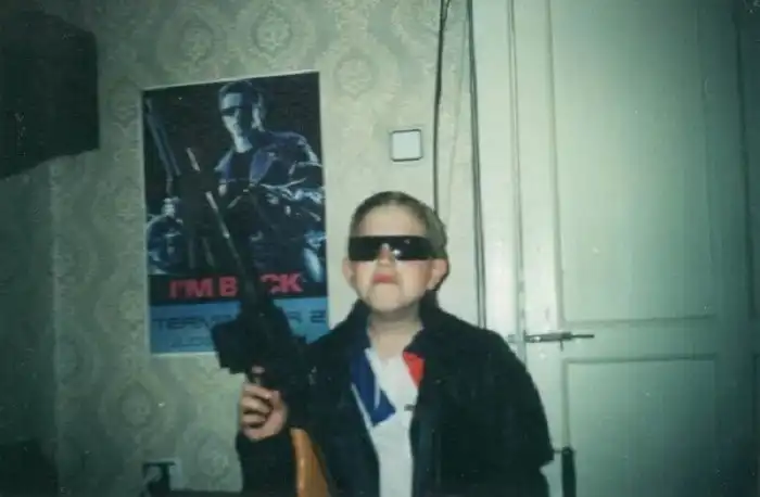 46. «И восстали машины из пепла ядерного огня...» Парень на фоне плаката второго Терминатора, 1990-е годы