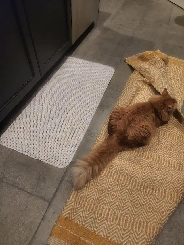 Желтый коврик все время скользил, тогда я подложил под него дешевый кухонные коврик, он прорезиненный