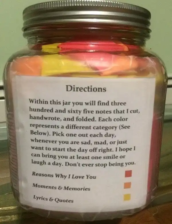 "В этой банке ты найдёшь 365 записок. Три цвета - три категории: почему я тебя люблю, наши приятные воспоминания, стихи и цитаты. Бери по одной каждый день, в каком бы настроении ты ни была. Надеюсь, что добавлю в твой день минимум одну улыбку. Никогда не переставай быть собой".