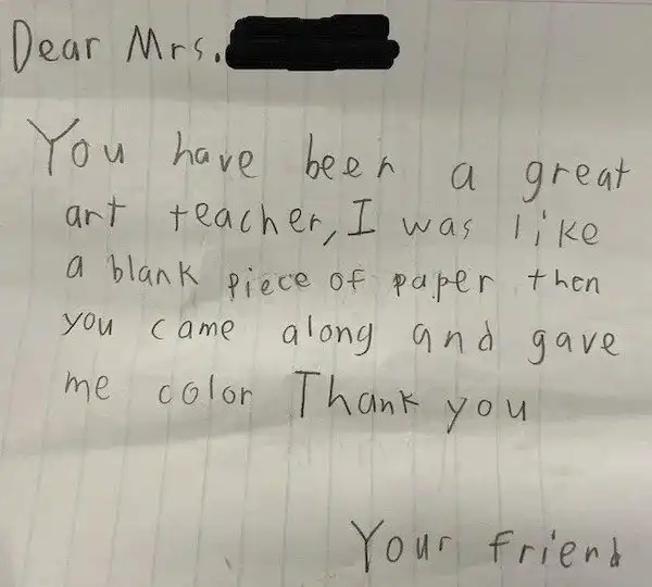 "Вы прекрасный учитель рисования. Я была как чистый лист бумаги, а потом пришли вы и раскрасили меня. Спасибо".