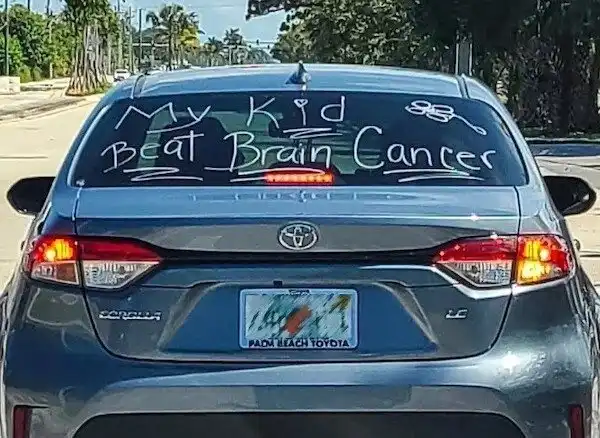 16. "У меня сегодня был не лучший день, но эта надпись меня вдохновила: "Мой ребёнок победил рак мозга"