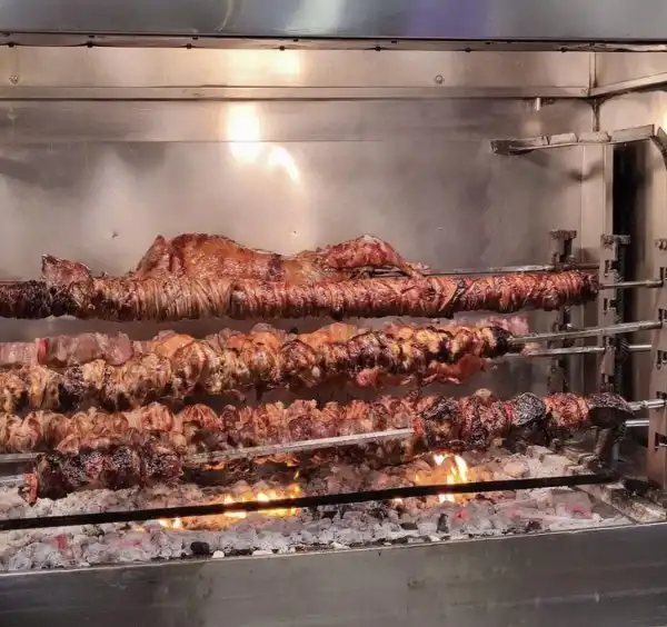 «Вот так здесь жарят все: кебаб из баранины, свинины, курицы и мой любимый кокореци». Кокореци — это мясное блюдо, которое готовится из бараньих или козьих кишок, обернутых вокруг субпродуктов.