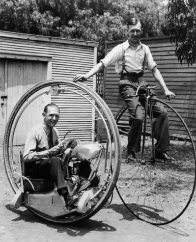 Моноколесо и его создатель Уолтер Нильссон (слева) рядом с мужчиной на велосипеде пенни-фартинг