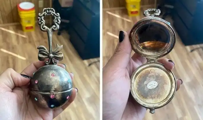 Серебряная шкатулка в виде погремушки — внутри хранили, например, прядь волос ребёнка