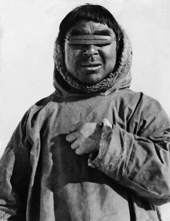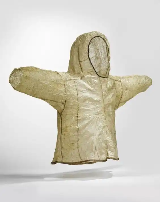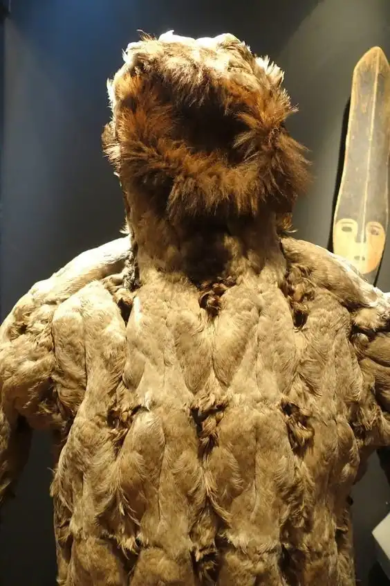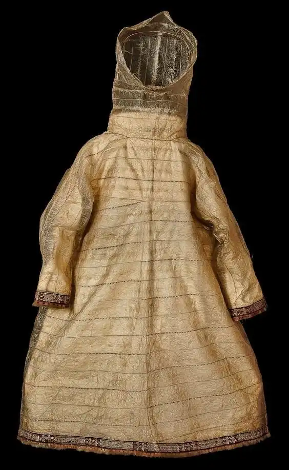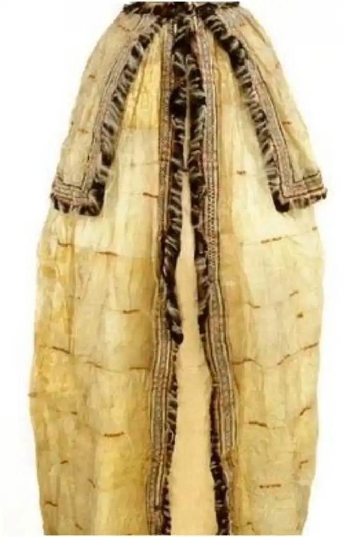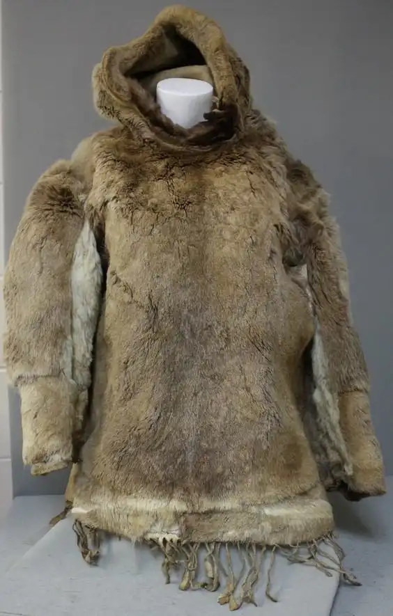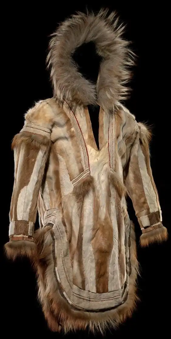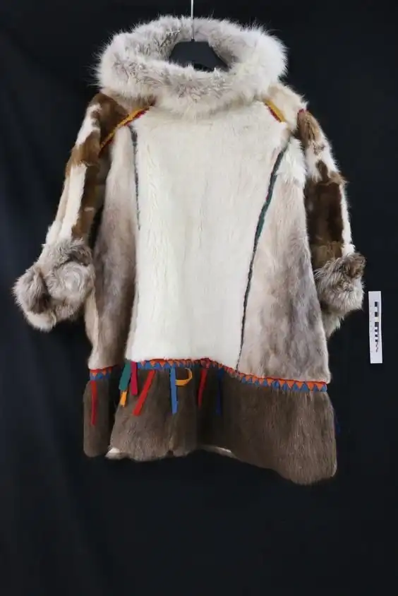 Рубаха изготовлена из легких, как перышко, кишок морских млекопитающих, а не из тяжелой шерсти. Аппликация из пищевода тюленей, вышивка из волос карибу, цветная пряжа, перья баклана и человеческие волосы добавляют ему красоты.