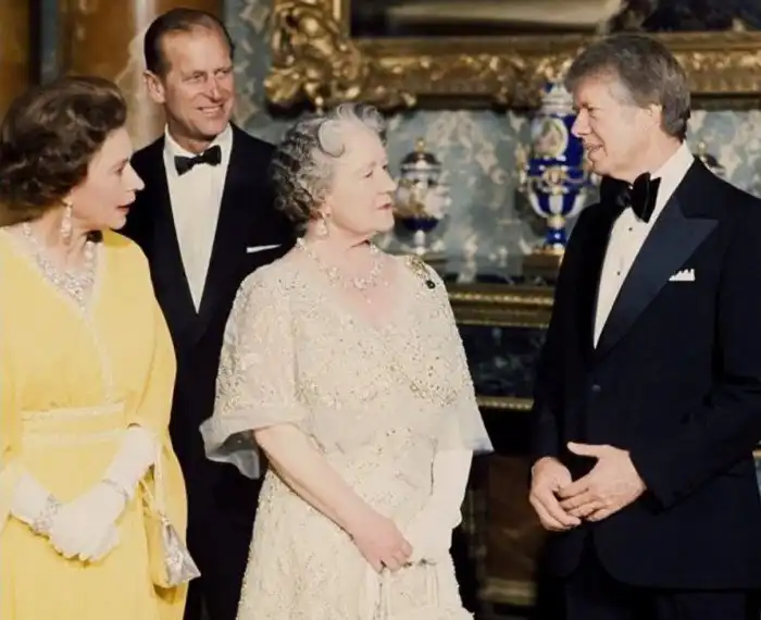 Королевская семья принимала американского президента и других глав государств во время саммита НАТО в мае 1977 года. Как многие знают, президент Джимми Картер тогда нарушил королевский протокол, поцеловав королеву-мать в губы во время ужина в Букингемском дворце. И Елизавета, и ее мать были ошарашены, а сама королева-мать заявила, что "никто так не делал с тех пор, как умер мой муж"