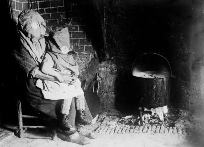 23. Мать с ребёнком в убежище в противогазах. Франция, 1916 год