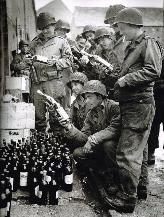7. Американские солдаты рассматривают вино в Шербуре, Франция, июнь 1944 года