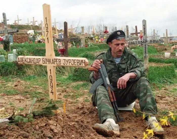 13. Русский доброволец, приехавший воевать за сербов в Боснийской войне, у могилы погибшего друга. Через месяц его похоронят неподалеку, июнь 1994 год