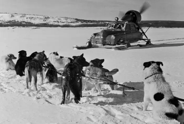 18. Собачья упряжка встречает аэросани с кузовом автомобиля «Победа»: "Север-2". СССР, Камчатка, 1962 год