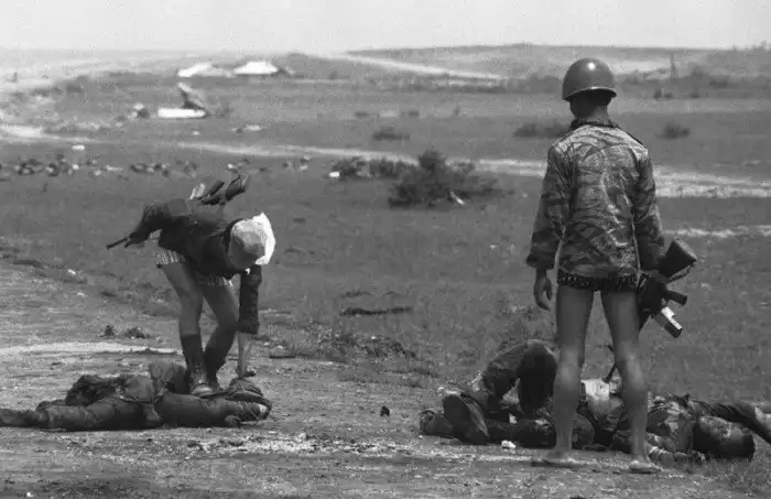 19. Южновьетнамские морские пехотинцы проверяют тела убитых северовьетнамских солдат на наличие сигарет и ценностей. 5 мая 1972 год