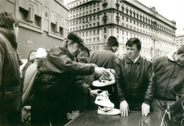26. Уличная торговля заграничными кроссовками в Москве, (1600 руб.), 1992 год