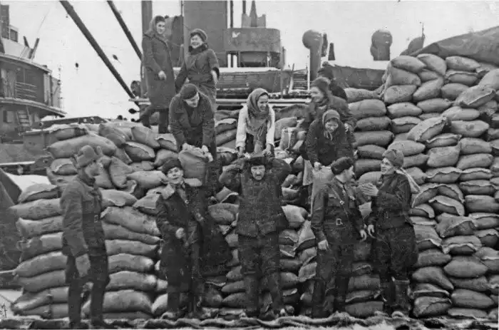36. Разгрузка транспорта союзников в мурманском порту. 1942 год