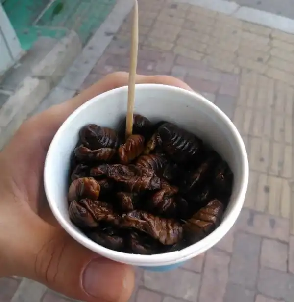 «Такая вот закуска — жареные личинки. Пахнут и на вкус просто как масло. Если закрыть глаза, то ничего страшного»