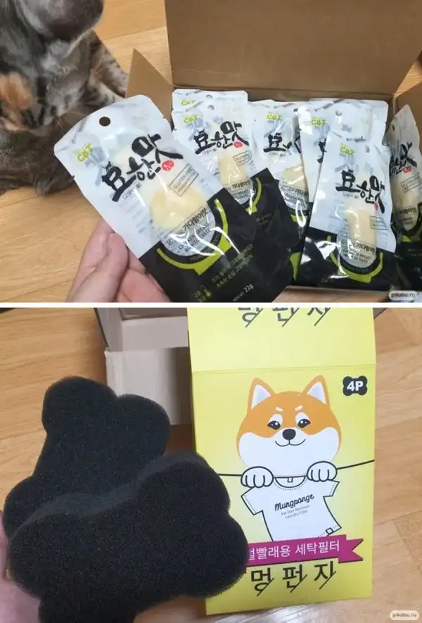 Необычные товары для кошек можно купить в Корее: куриная грудка для питомцев и спонжи для сбора шерсти во время стирки