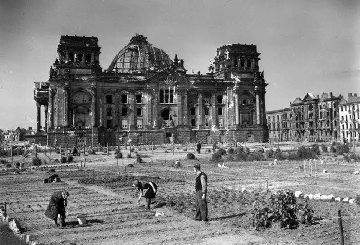 2. Нeмцы сажают овощи пeред здaнием рейхстага, 1946 год