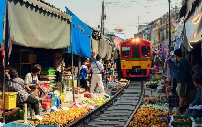 А в Тайланде существует один рынок, ничем не примечательный на первый взгляд. Однако его ряды частенько можно увидеть в фильмах, ведь по центру его разделяют железнодорожные пути. Поезд со скоростью 15 км/час проходит через рынок 8 раз в день.