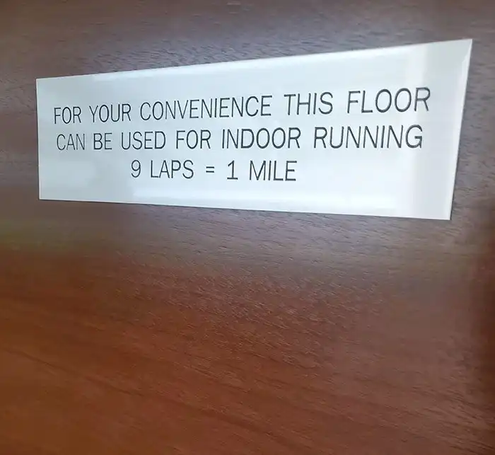17. "Для вашего удобства, этот этаж можно использовать для бега. 9 кругов = 1 миля"