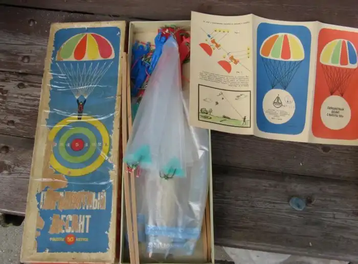 В 70-е гг. был налажен выпуск двух похожих по замыслу, но немного разных по принципу работы игрушек. Одна из них, "Парашютный десант", в продаже встречалась нечасто, а по способу запуска была несколько сложнее второй.