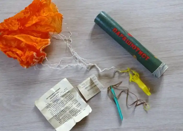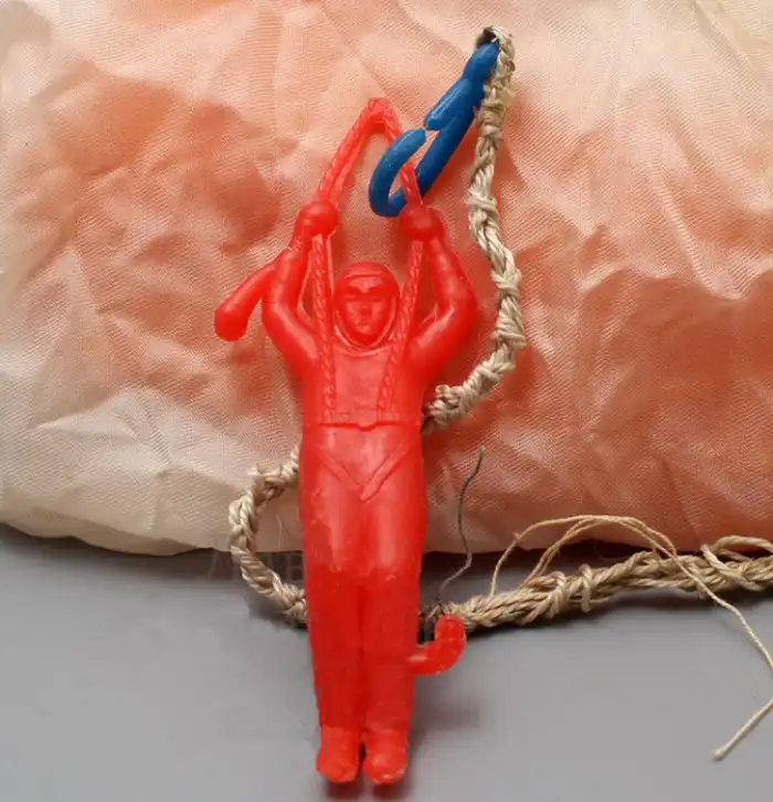 Вторая игрушка на тему парашютного спорта была и проще, и дешевле, и менее дефицитной. Она представляла собой комплект из пластмассовой рогатки, полиэтиленовой фигурки с крючочком на ноги и парашюта, сделанного из обрезков нейлона или парашютного шелка.
