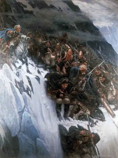 Полотно Василия Ивановича Сурикова Переход Суворова через Альпы в 1799 году продолжает тему воинского героизма русских людей, начатую в Покорении Сибири. Картина написана к столетию Итальянского похода А.В. Суворова. Её сюжетом художник избрал момент, когда русская армия спускается с горы Паникс. Для работы над полотном живописец поехал в Швейцарию. Главное в картине - движение, беззаветная храбрость воинов и верность их командиру. Пейзаж картины – уходящие ввысь вершины гор, окутанные пеленой облаков, то тёмные, то сверкающие холодным голубоватым блеском, - позволяет остро ощутить трудности перехода, почувствовать значительность подвига суворовских богатырей.