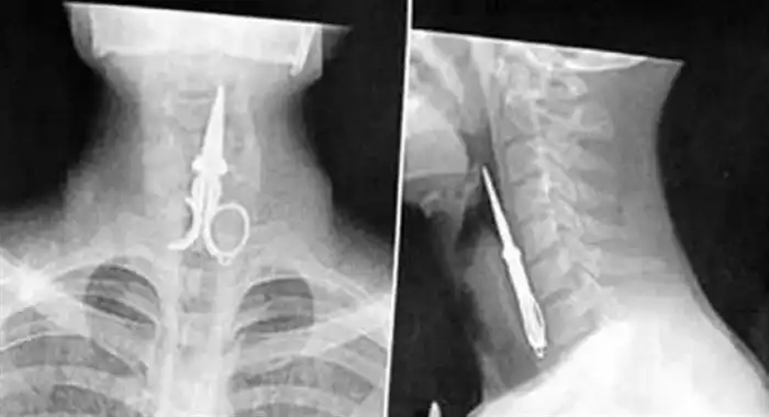 И снова о ножницах. Это человек пытался использовать их как зубочистку. Вышло, как видите, неудачно.