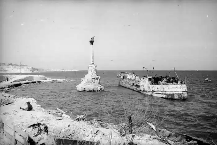 27. Разбитый немецкий корабль у Памятника затопленным кораблям в Севастополе. 1944г. Автор: Евгений Халдей