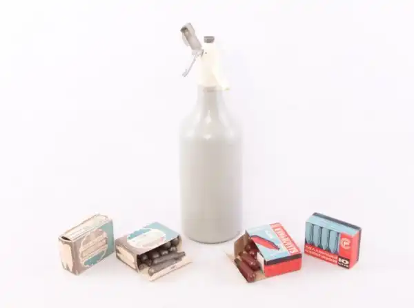 Такие сифоны с навинчивающейся на них головкой со сливом и обоймой для баллончика с жидкой углекислотой использовали для приготовления или хранения газированной воды и напитков.