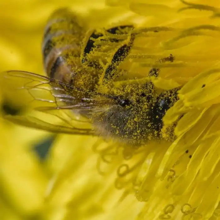 Пчела в пыльце одуванчика