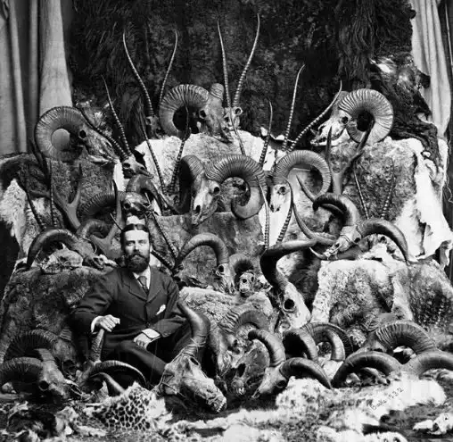 Британская Индия, 1883 год. Английский мужчина, на плечах которого, как говорил Редьярд Киплинг, лежит так называемое "бремя белых". Он демонстрирует трофеи, которые добыл на охоте. Это черепа буйволов, антилоп, кутенейских баранов, горных козлов, шкуры леопардов и других живых существ. Глядя на такие фотографии становится понятно, почему индусы так радостно избавлялись от "носителей цивилизации" и вспоминают английских колонистов недобрым словом.