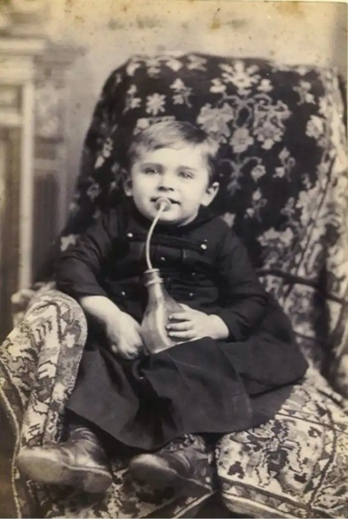 Это викторианская эпоха. Ребёнок пьёт из специальной бутылочки для вскармливания питательную смесь. Сначала это изобретение было с восторгом встречено мамами той эпохи - ведь для кормления нужно было снимать (а потом надевать) неудобные корсеты с бесконечными завязками. Бутылочки облегчили жизнь, а вот расплата была жестокой: в Британии резко выросла детская смертность. Довольно-таки скоро врачи поняли, что причиной бактериальных инфекций стали именно хвалёные бутылочки, которые невозможно было хорошо помыть. Пресса тут же обозвала их "бутылочками-убийцами".