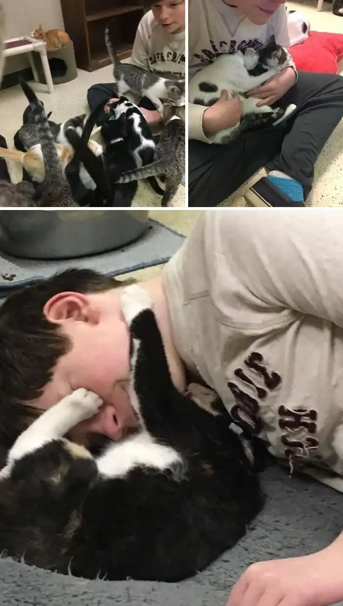 Мой сын страдает аутизмом и любит кошек настолько, что в течение последних 4 лет он добровольно социализировал кошек и котят в нашем местном приюте для животных, чтобы помочь найти им новых хозяев.