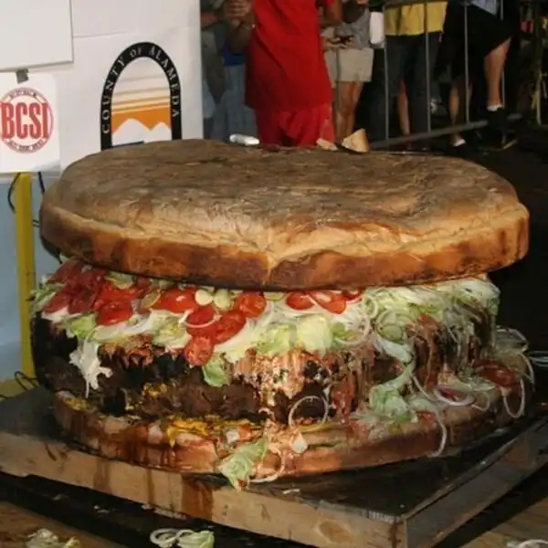 Это самый большой гамбургер в мире. Он весит 350 кг и имеет более миллиона калорий