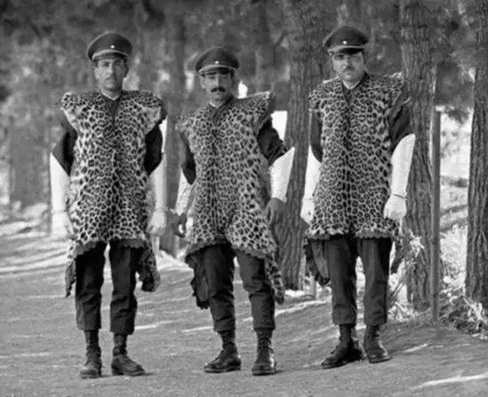 Элитный отрад иранского шаха Мохаммеда Реза Пехлеви в униформе из шкур леопарда, 1960 год, Тегеран.