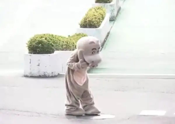 В зоопарке Нагои проводят симуляцию побега бегемота, чтобы слаженно действовать в случае настоящего побега. Бегемота изображает сотрудник в костюме